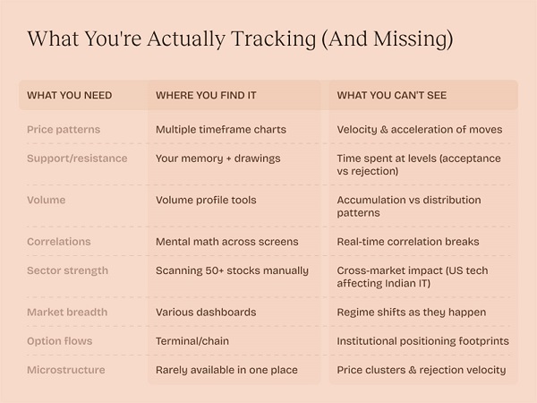 Institutional trading desks employ entire teams. One person watches correlations. Another tracks order flows. Someone else manages risk. Individual traders attempt everything alone with tools that haven’t fundamentally changed since the 1990s. Half the market operates invisibly. Velocity shifts predict momentum changes before they happen. Acceleration patterns signal reversals. Microstructure dynamics reveal whether selling represents accumulation or genuine distribution. These aren’t improvements to existing charts. They’re entirely different dimensions of market reality that require purpose-built systems to reveal. Take Thursday morning analyzing banking stocks. The traditional approach: check five tickers individually, compare RSI values, scan volume patterns, examine formations across timeframes, scramble through option chains. Thirty minutes later, you’ve missed the correlation break about to drive the entire sector. Now imagine a single conversation revealing HDFC’s velocity accelerating while ICICI’s momentum decelerates. Spotting accumulation patterns invisible on standard charts. Connecting overnight US banking weakness to specific impacts on Indian private banks versus PSUs. Not better analysis of what you see–revelation of what was always there.